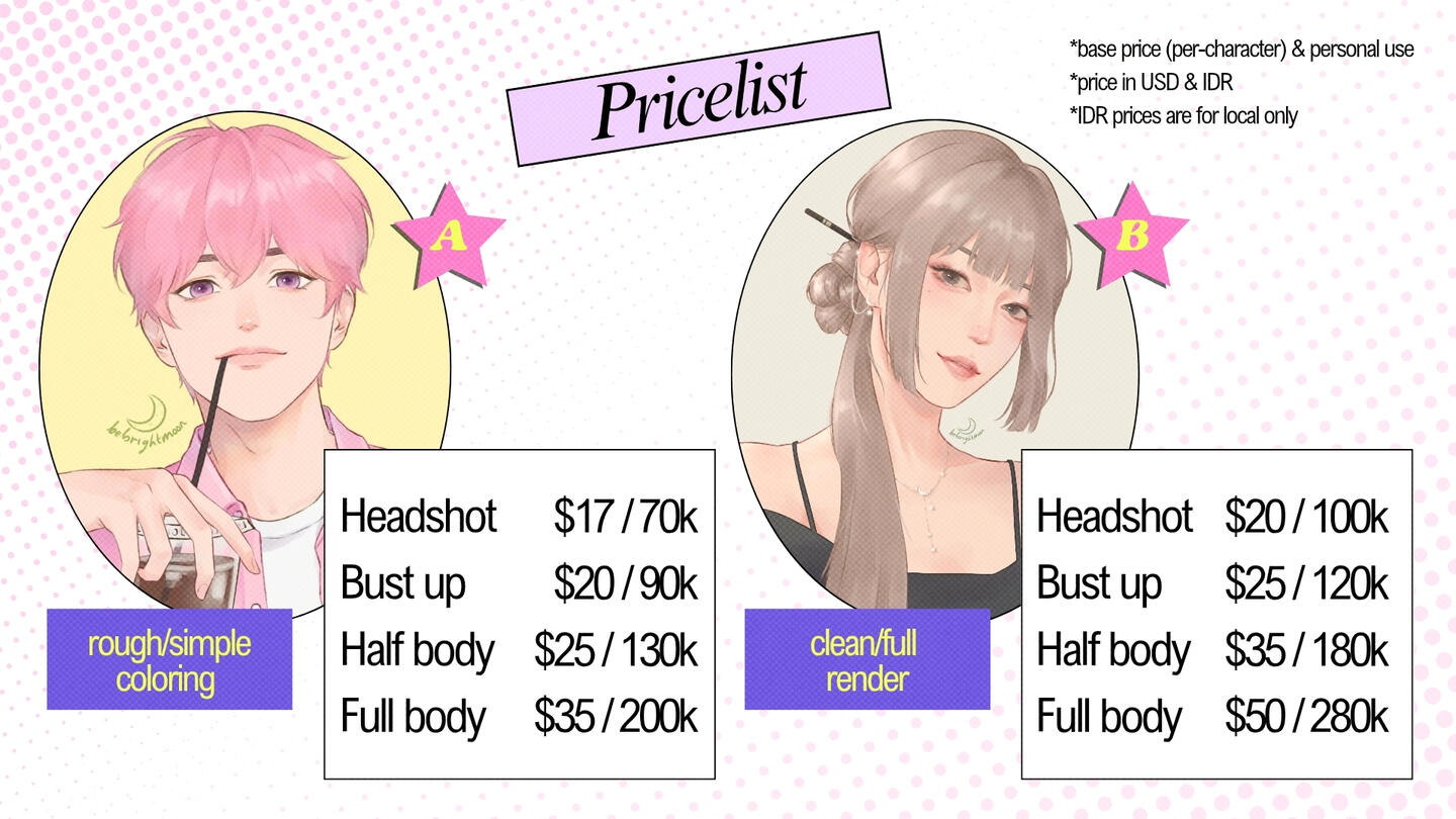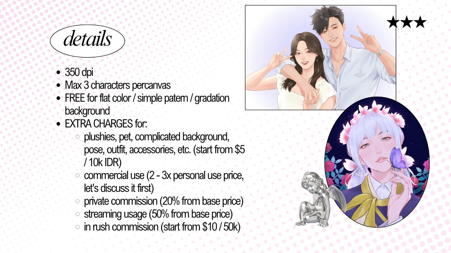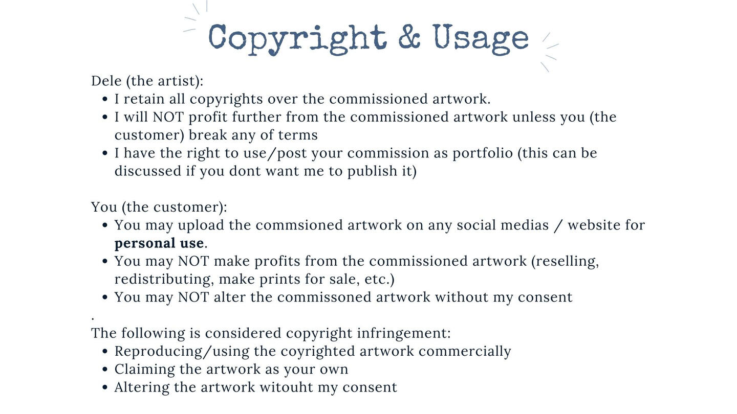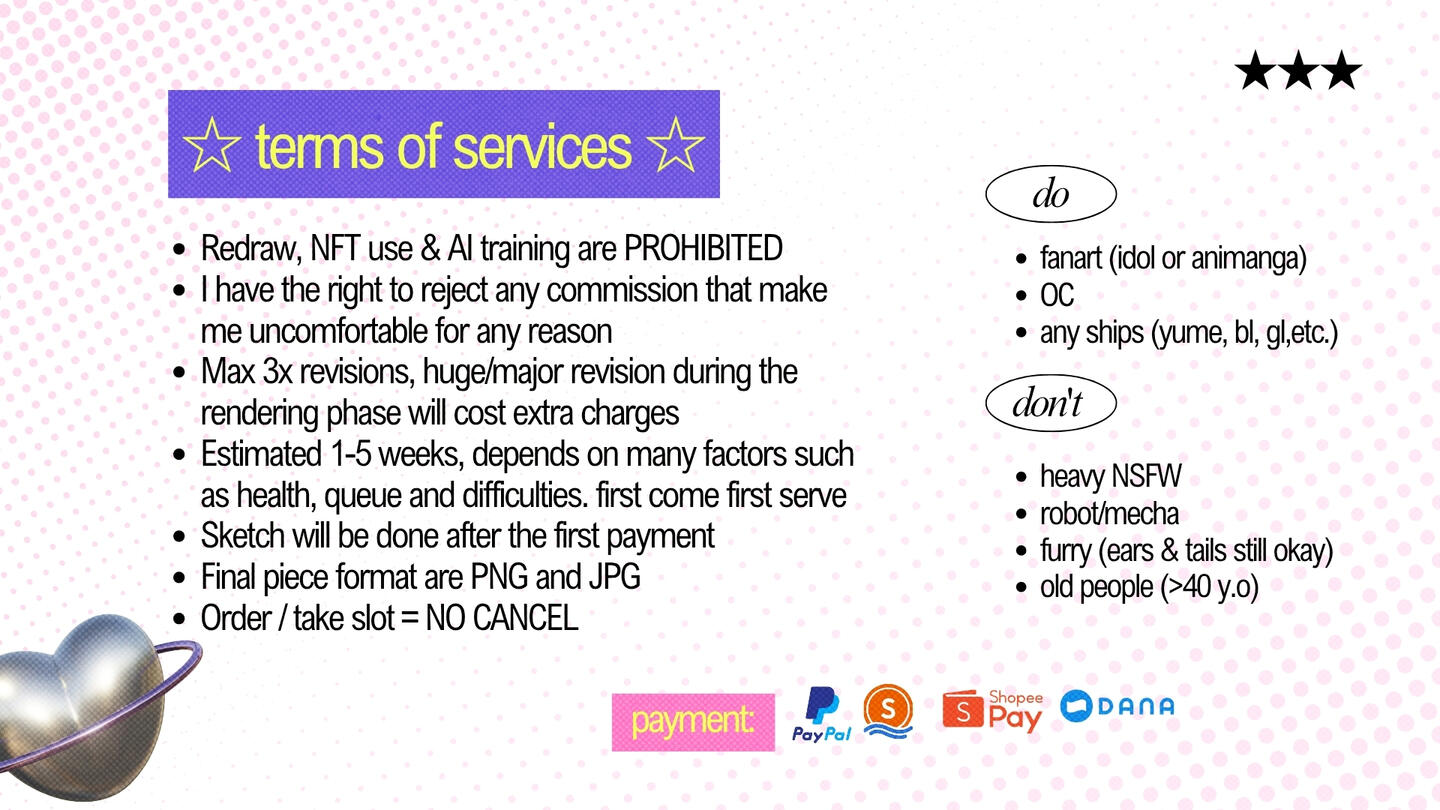 5. Pengerjaan sketsa akan dilakukan jika kamu sudah melakukan pembayaran DP. Aku akan memberikan update di setiap proses (sketch, lineart, coloring, rendering). Mohon bersabar ya kecuali kamu memang klien 'in rush'